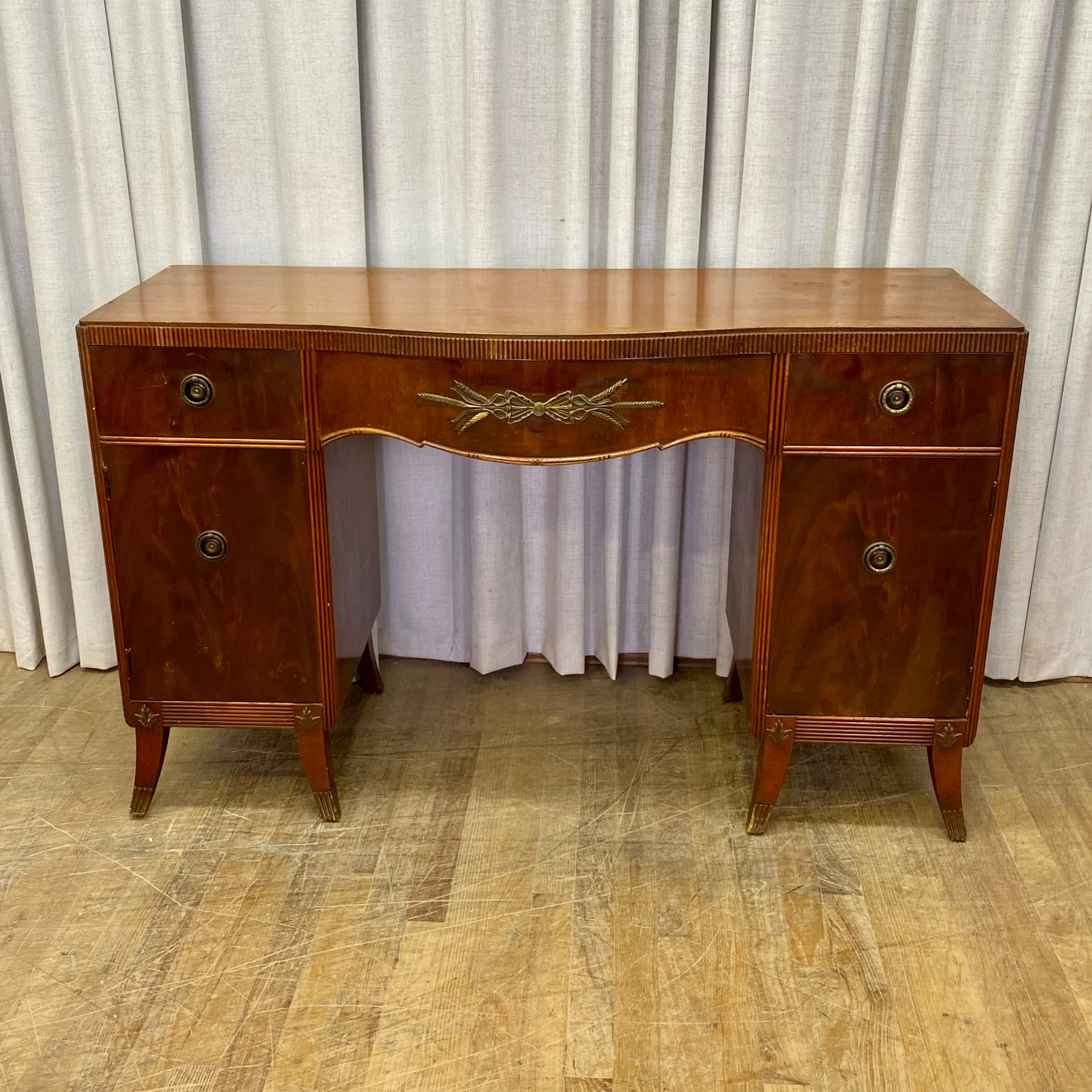 This charming Depression Era desk brings authentic vintage character to any workspace. Crafted with the sturdy construction typical of 1930s furniture, it features a spacious work surface perfect for writing, organizing, or displaying treasured items. The classic design complements both traditional and eclectic décor styles. Measuring 50"w x 19"d x 30"h, it fits comfortably in home offices, bedrooms, or living spaces. A functional piece with genuine historical appeal.