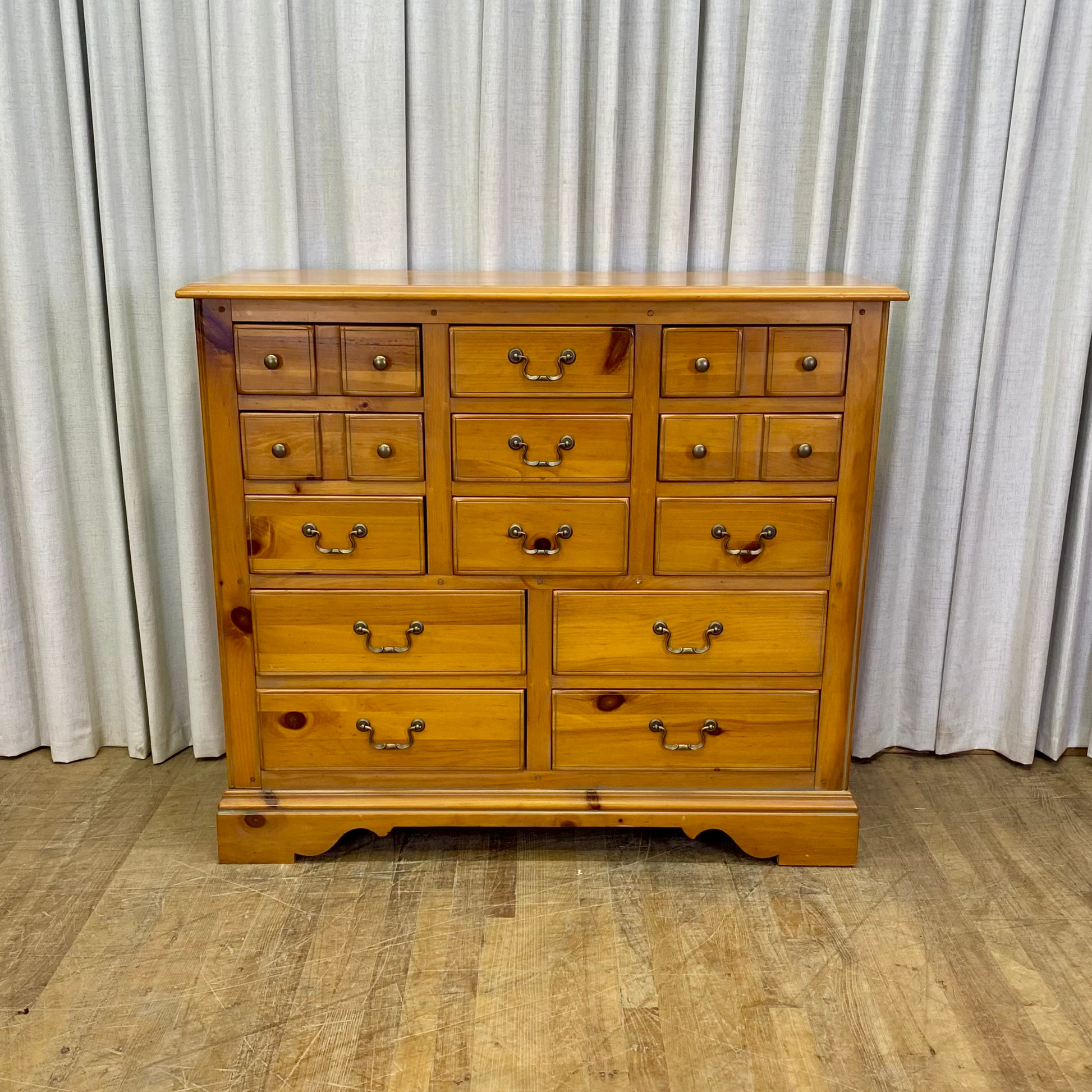 Check out this large pine dresser offers ample storage with dimensions of 48" wide, 19" deep, and 30" high. Crafted from durable pine wood, it provides plenty of space to organize your belongings while adding a classic touch to any room. Its great condition ensures lasting use and timeless appeal.