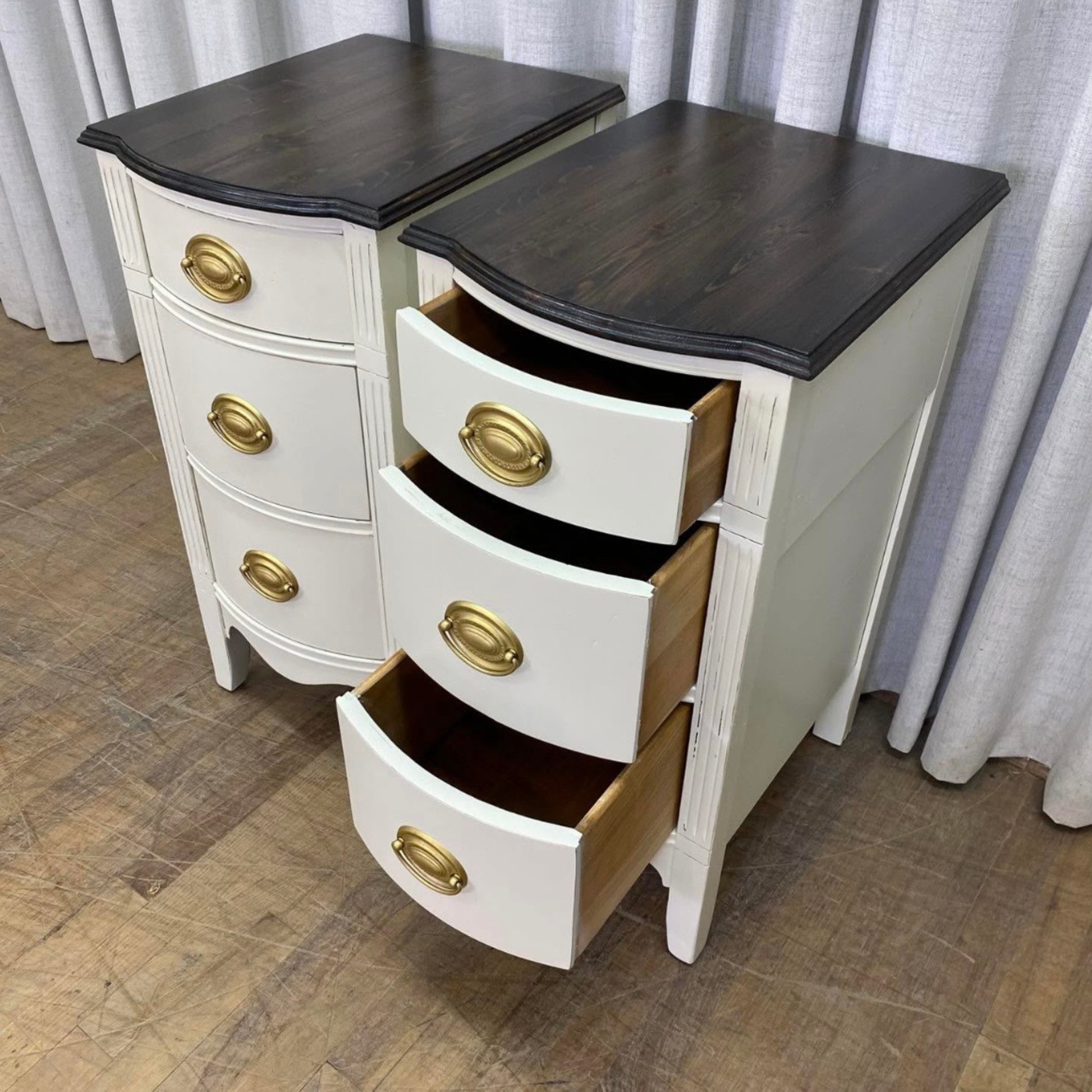 Set of two slender nightstands with authentic Hepplewhite styling. Each piece features a stained reclaimed wood surface that brings warmth and vintage character to your bedroom. At 14.5" wide, 18" deep, and 29.5" tall, these compact stands fit neatly in tight spaces without sacrificing elegance. The narrow profile makes them ideal for small bedrooms or tight corners, while the quality construction and timeless design ensure they'll complement your décor for years to come.