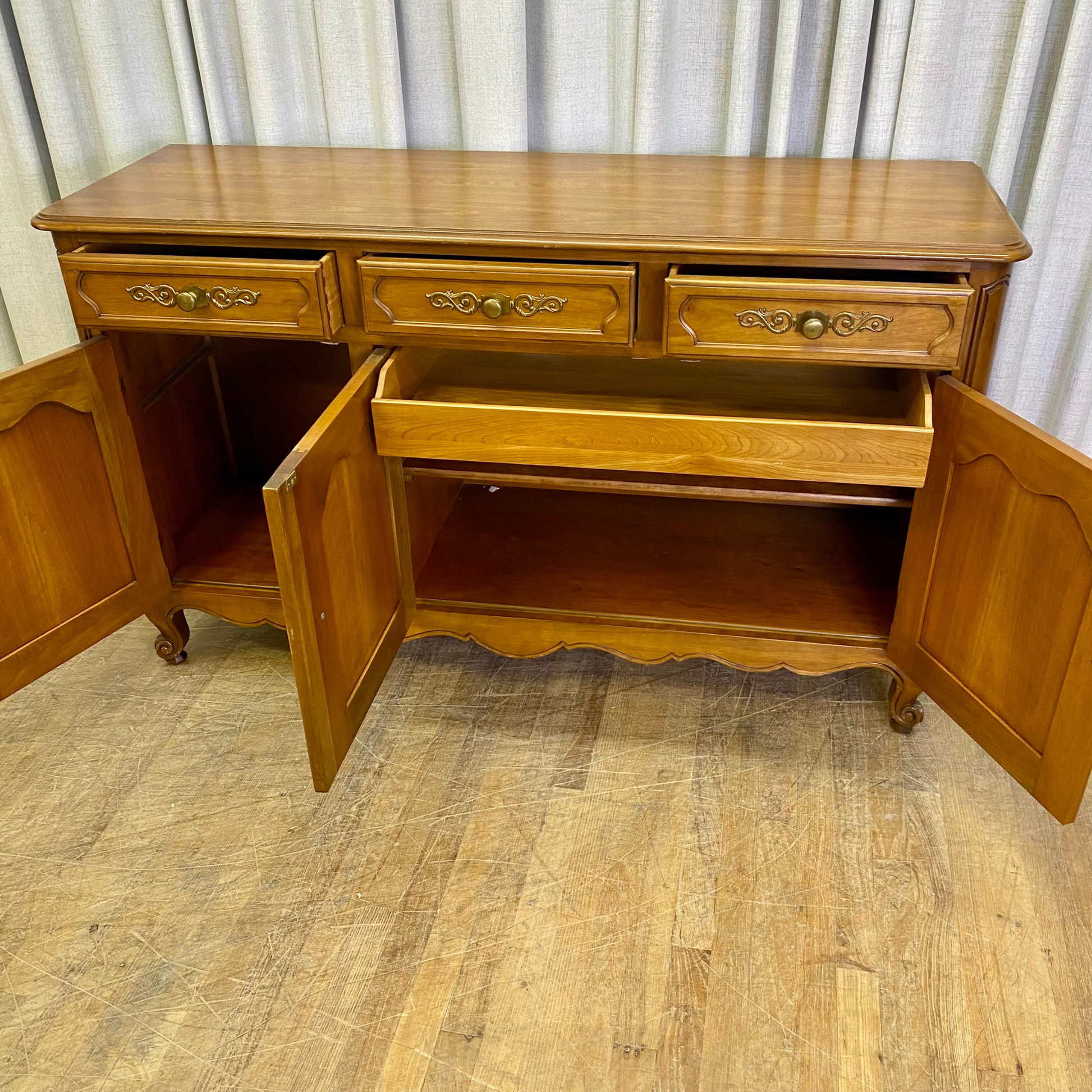 This three-door French sideboard combines elegant charm with practical size, measuring 58" wide, 19" deep, and 34" high. Its spacious design offers plenty of storage while adding a touch of classic sophistication to any room. Perfect for organizing essentials or displaying decor, it enhances your space with timeless style and functional appeal.