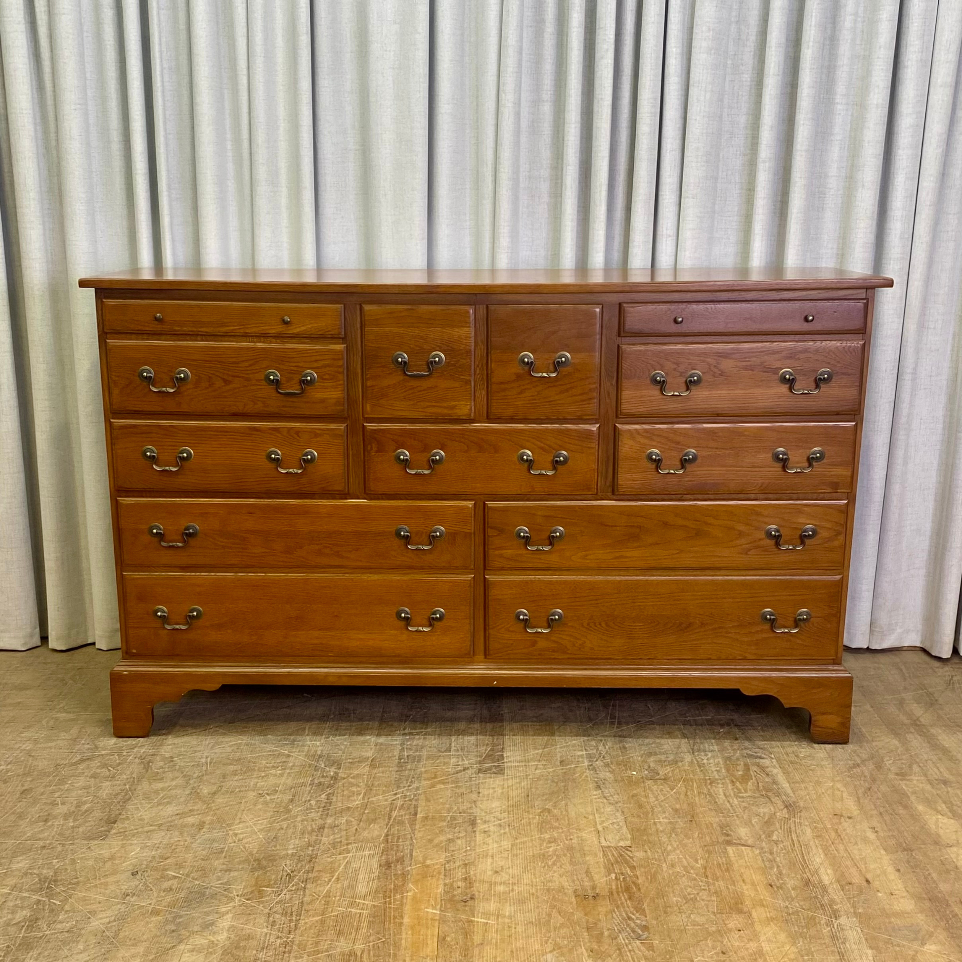 This spacious wood dresser offers ample storage with multiple drawers for all your essentials. Standing 39 inches tall and measuring 64 inches wide by 19 inches deep, it provides generous capacity without overwhelming your space. The tall design maximizes vertical storage while the substantial width accommodates plenty of items. Crafted by Keller, this dresser combines practical functionality with classic wood construction, making it an ideal addition to any bedroom.